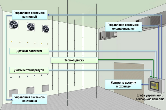 The system is designed to control and maintain the specified parameters of the product storage environment in the vegetable storage. The system provides automatic measurement, fixation, and memorization of the values of temperature, humidity, and gas content in the controlled sections.