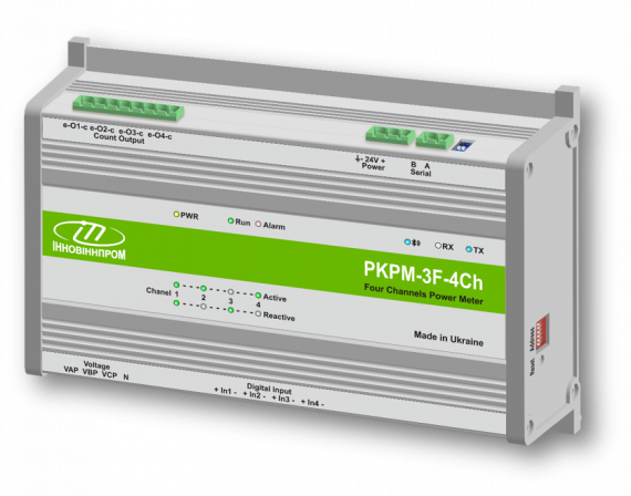 The device monitors active/reactive/total energy, current values of voltage and current in the phases of each of the four channels of a three-phase electrical network. Current measurement is carried out by connecting measuring three-phase current transformers of the TST series.